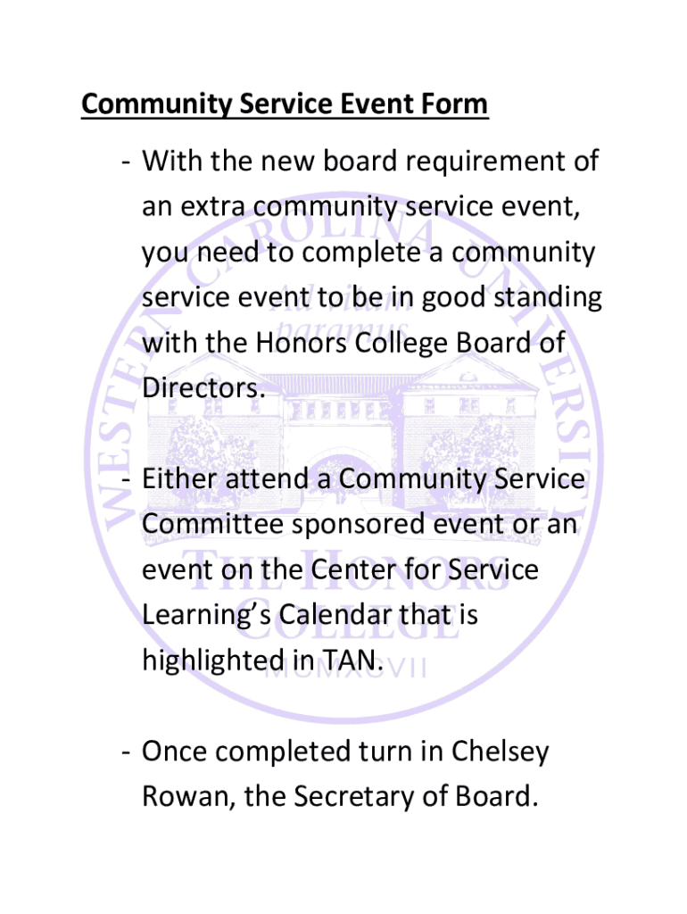 Community Service Event Form With the new board requirement of an extra community service event, you need to complete a community service event to be in good standing with the Honors College Board