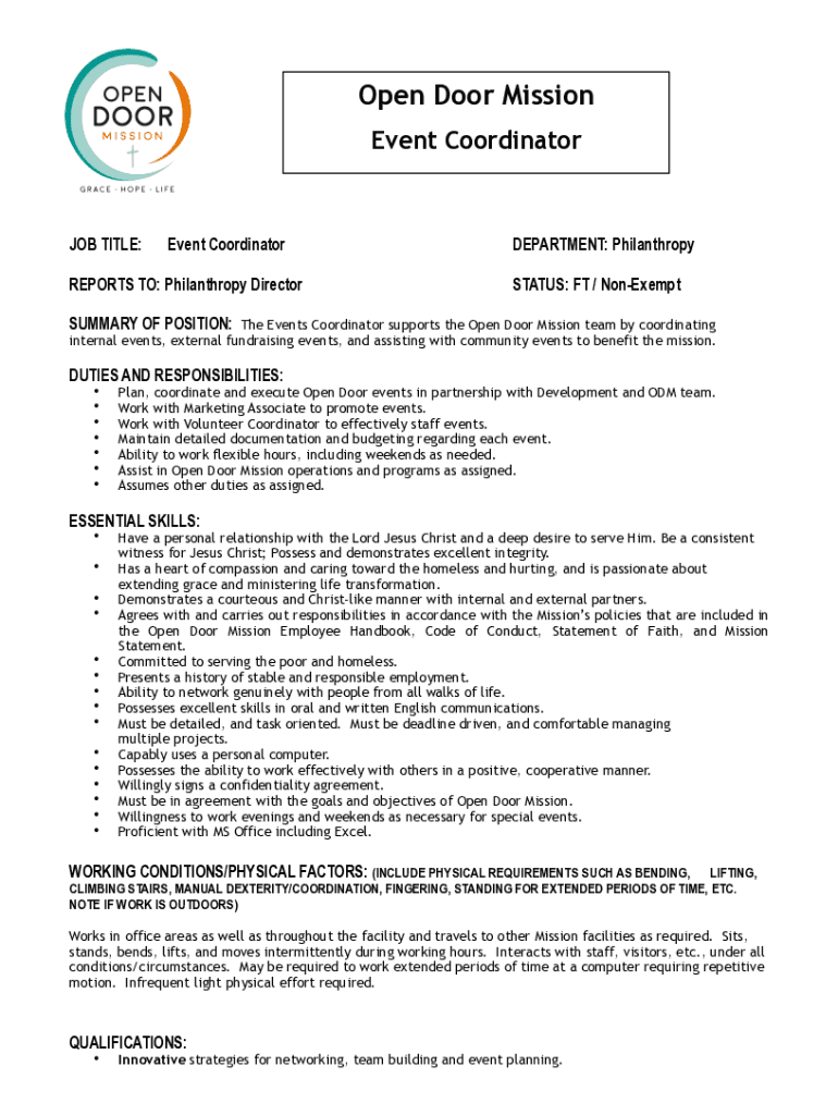 Event Coordinator TITLE:Event CoordinatorREPORTS TO: Philanthropy DirectorDEPARTMENT: Philanthropy