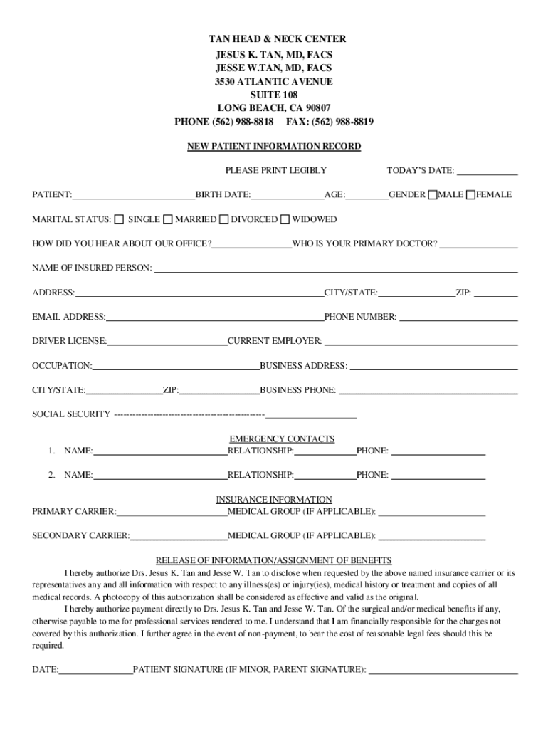 TAN HEAD & NECK CENTER JESUS K. TAN, MD, FACS JESSE W.TAN, MD, FACS 3530 ATLANTIC AVENUE SUITE 108 LONG BEACH, CA 90807 PHONE (562) 9888818 FAX: (562) 9888819 NEW PATIENT INFORMATION RECORD TODAYS