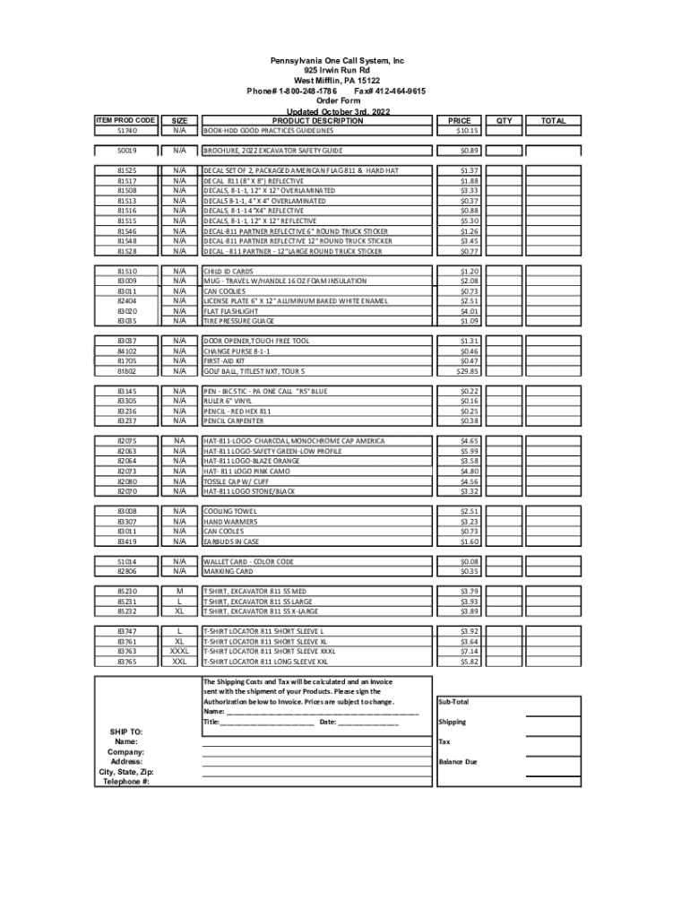 Pennsylvania One Call System, Inc 925 Irwin Run Rd West Mifflin, PA 15122 Fax# 4124649615 Phone# 18002481786 Order Form Updated October 3rd, 2022 51740SIZE N/PRODUCT DESCRIPTION BOOKHDDGOODPRACTICESGUIDELINES50019N/BROCHURE,2022EXCAVATORSAFETYGUIDE$0.8981525