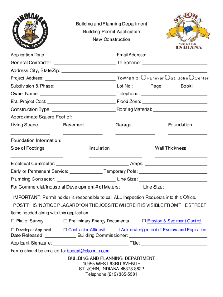Building and Planning Department Building Permit Application New ConstructionApplication Date:Email Address:General Contractor:Telephone:Address City, State Zip: Project Address:Township: Hanover