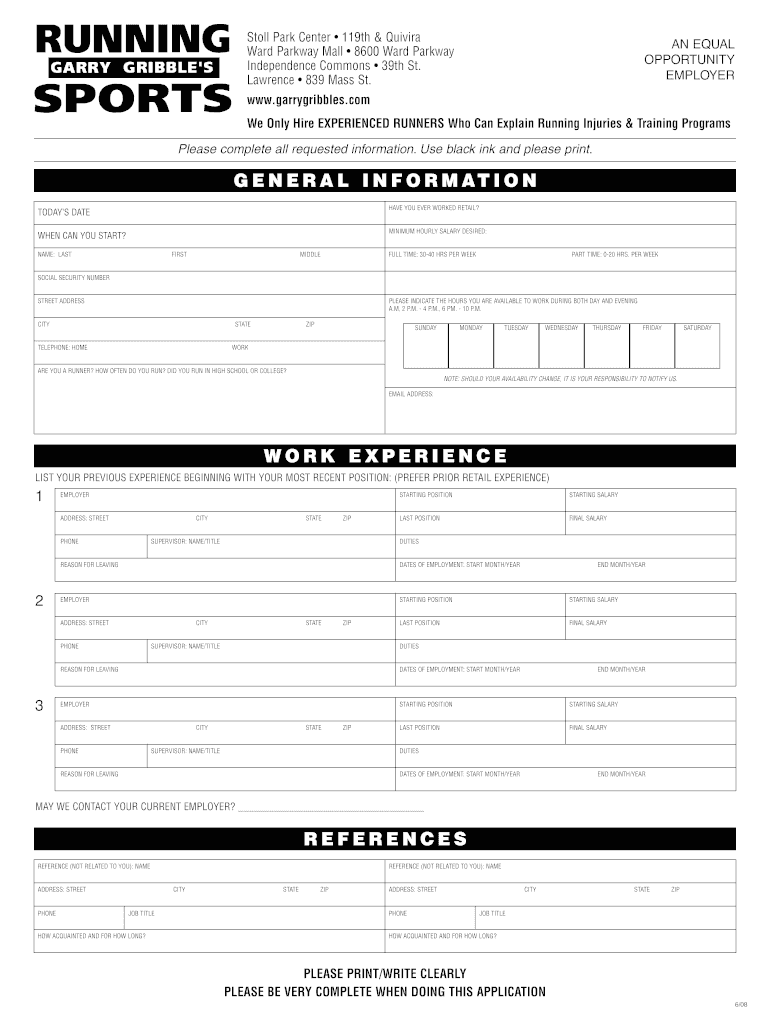 The Job Application Form is an employment document used by Garry Gribbles Running Stores to hire experienced runners for retail positions focused on running injuries and training programs.