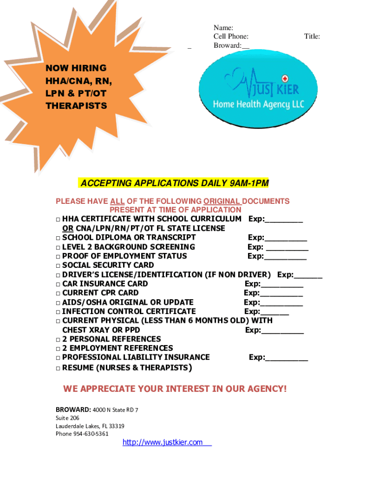 _Name: Cell Phone: Broward:__Title:NOW HIRING HHA/CNA, RN, LPN & PT/OT THERAPISTS 0344ACCEPTING APPLICATIONS DAILY 9AM1PM PLEASE HAVE All the FOLLOWING ORIGINAL DOCUMENTS PRESENT AT TIME OF APPLICATION