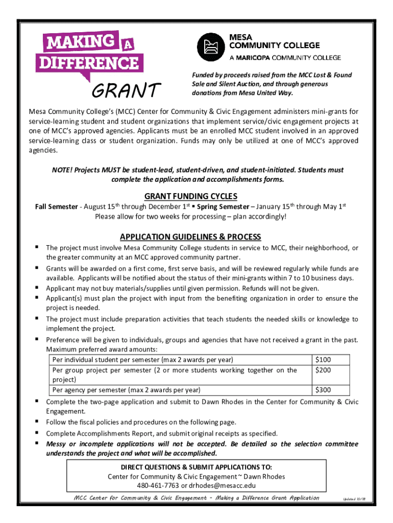 GRANTFunded by proceeds raised from the MCC Lost & Found Sale and Silent Auction, and through generous donations from Mesa United Way. Mesa Community Colleges (MCC) Center for Community & Civic Engagement