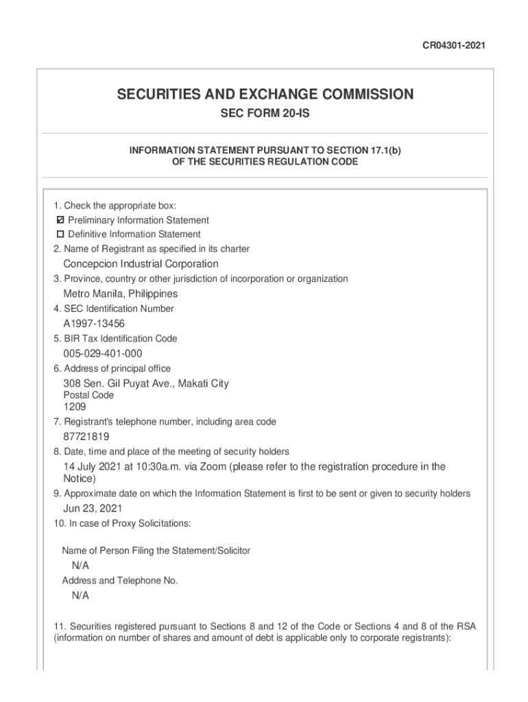 CR043012021SECURITIES AND EXCHANGE COMMISSION SEC FORM 20IS INFORMATION STATEMENT PURSUANT TO SECTION 17.1(b) OF THE SECURITIES REGULATION CODE1. Check the appropriate box: Preliminary Information