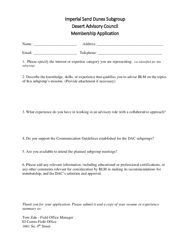 Imperial Sand Dunes Subgroup Desert Advisory Council Membership Application Name: ___Address: ___Email: ___ Telephone: ___ 1. Please specify the interest or expertise category you are representing: