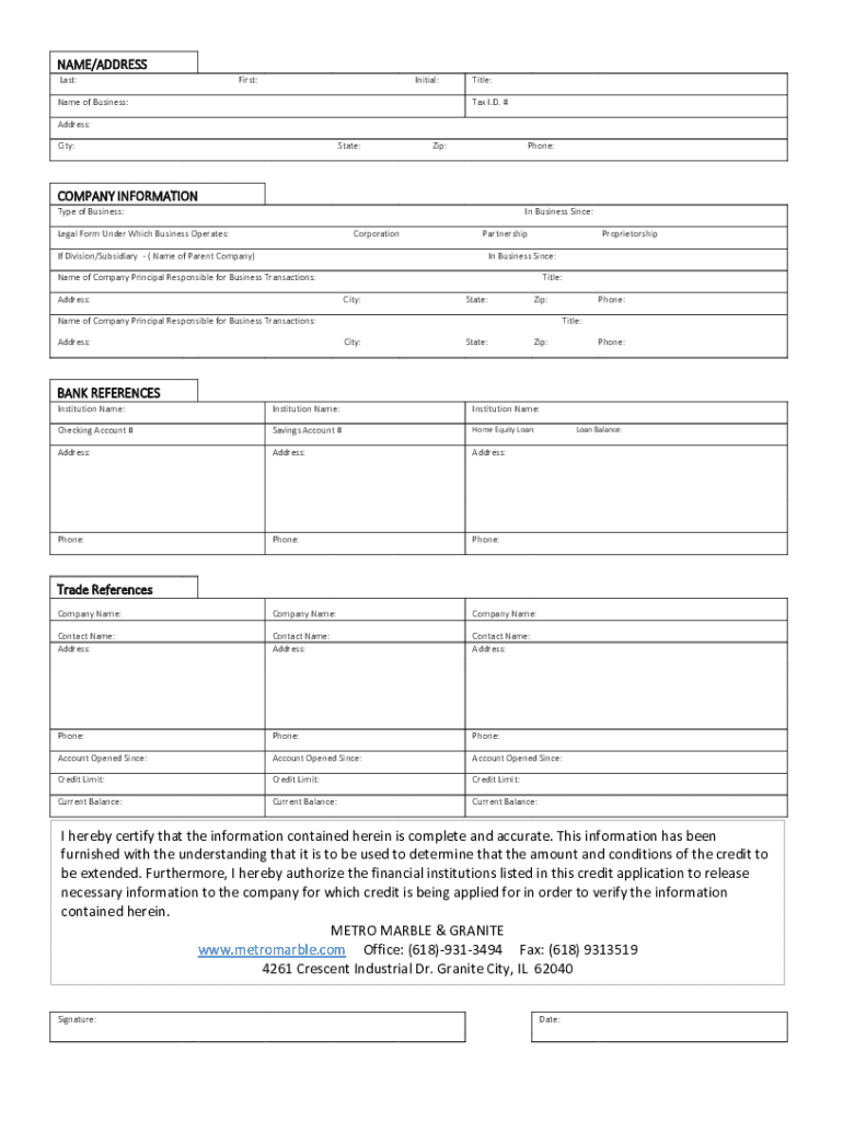 NAME/ADDRESS Last:First:Initial:Name of Business:Title: Tax I.D. #Address: City:State:Zip:Phone:COMPANY INFORMATION Type of Business:In Business Since:Legal Form Under Which Business Operates:CorporationPartnershipIf