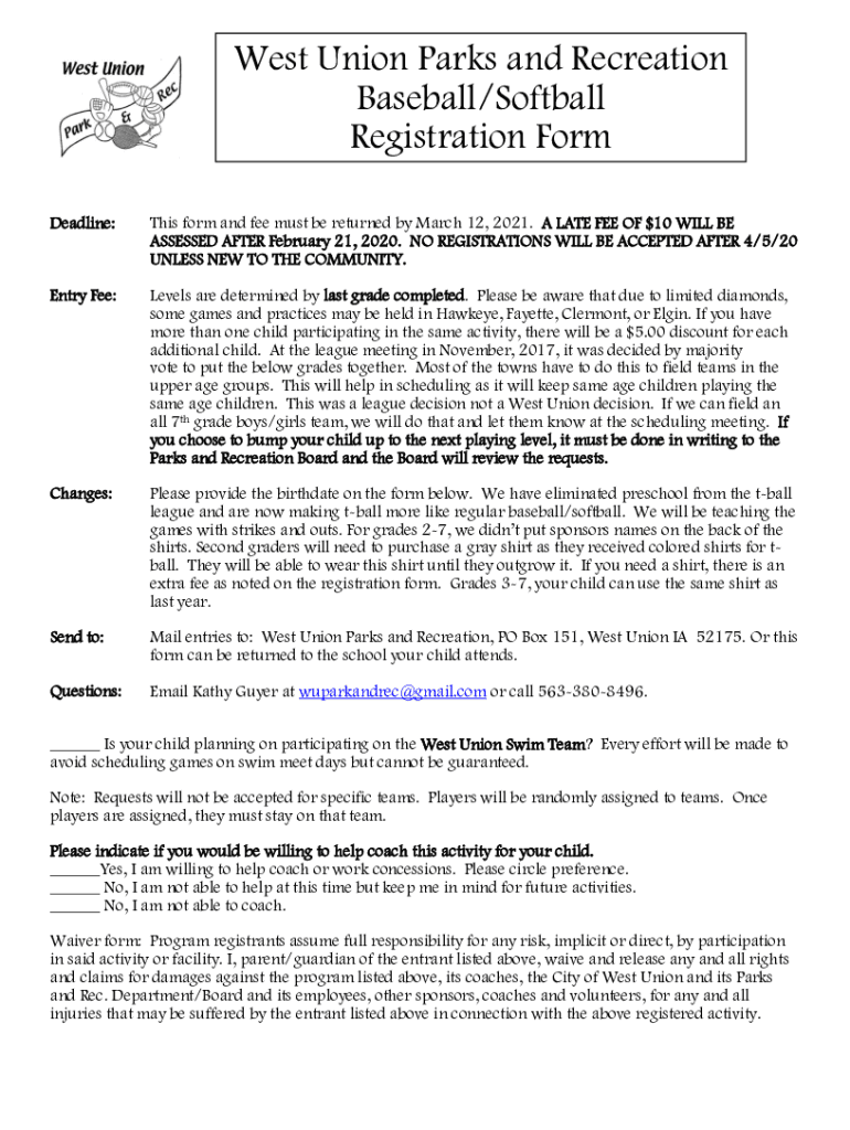 West Union Parks and Recreation Baseball/Softball Registration Form Deadline:This form and fee must be returned by March 12, 2021. A LATE FEE OF $10 WILL BE ASSESSED AFTER February 21, 2020. NO REGISTRATIONS