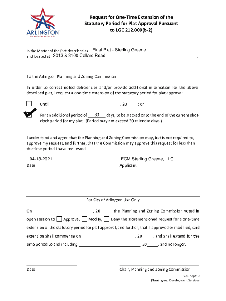 Request for Onetime Extension of the Statutory Period for Plat Approval Pursuant to LGC 212.009(b2)Final Plat Sterling Greene In the Matter of the Plat described as ___ 3012 & 3100 Collard Road and