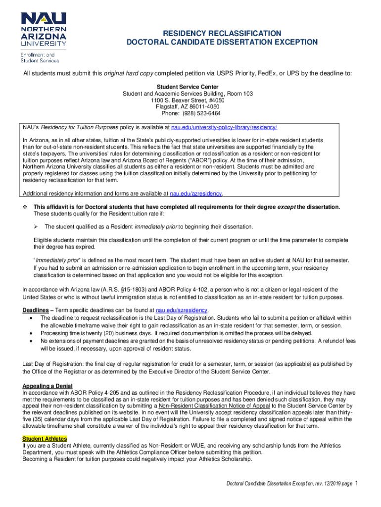 RESIDENCY RECLASSIFICATION DOCTORAL CANDIDATE DISSERTATION Exceptional students must submit this original hard copy completed petition via USPS Priority, FedEx, or UPS by the deadline to: Student
