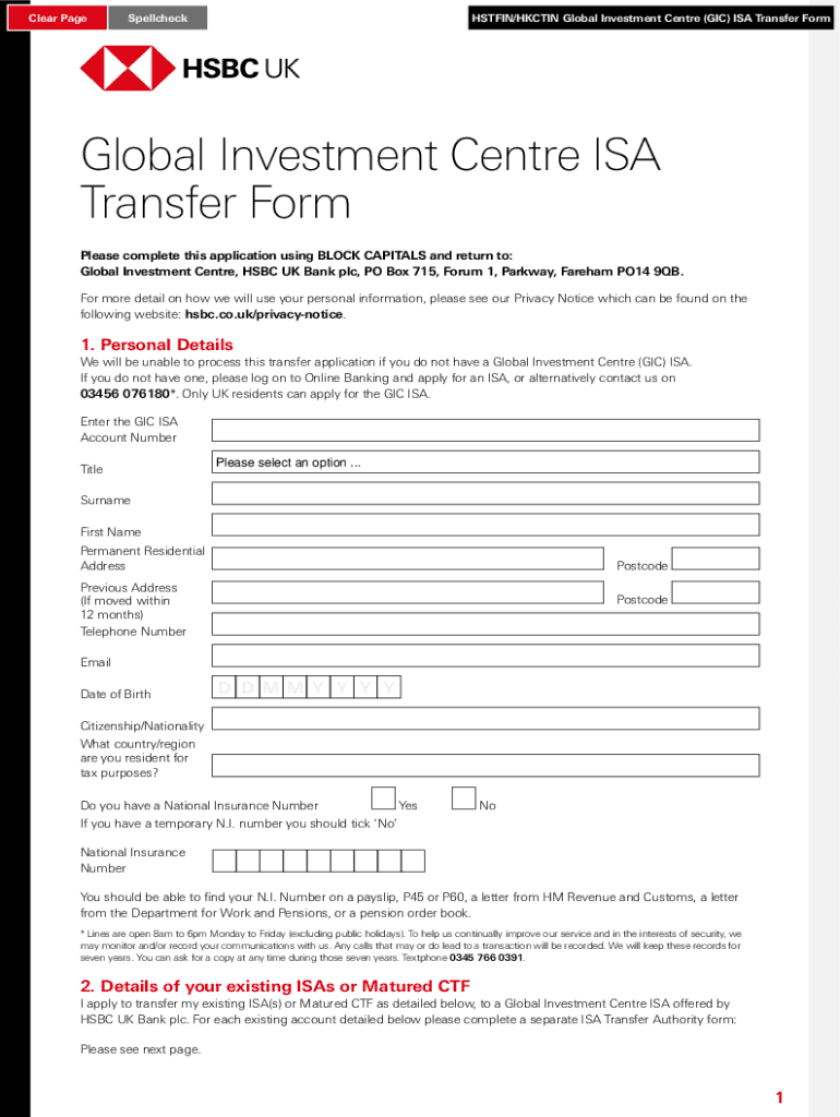 Clear PageSpellcheckHSTFIN/HECTIC Global Investment Center (GIG) ISA Transfer FormGlobal Investment Center ISA Transfer Form Please complete this application using BLOCK CAPITALS and return to: Global