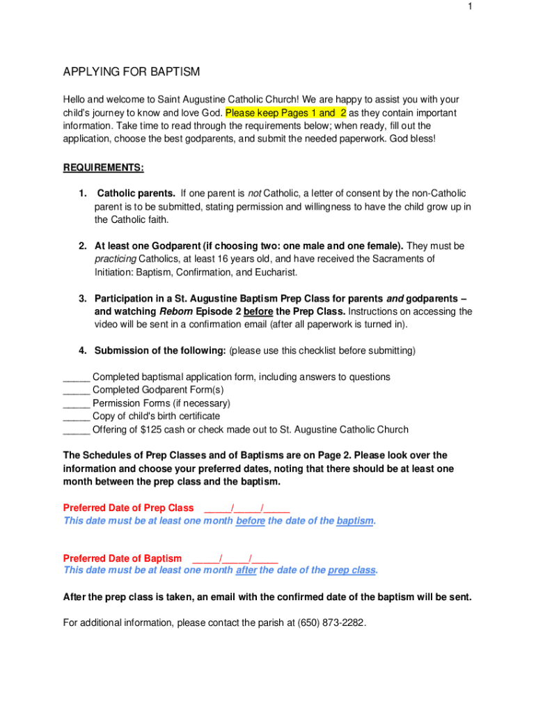 1APPLYING FOR BAPTISM Hello and welcome to Saint Augustine Catholic Church! We are happy to assist you with your children journey to know and love God. Please keep Pages 1 and 2 as they contain important