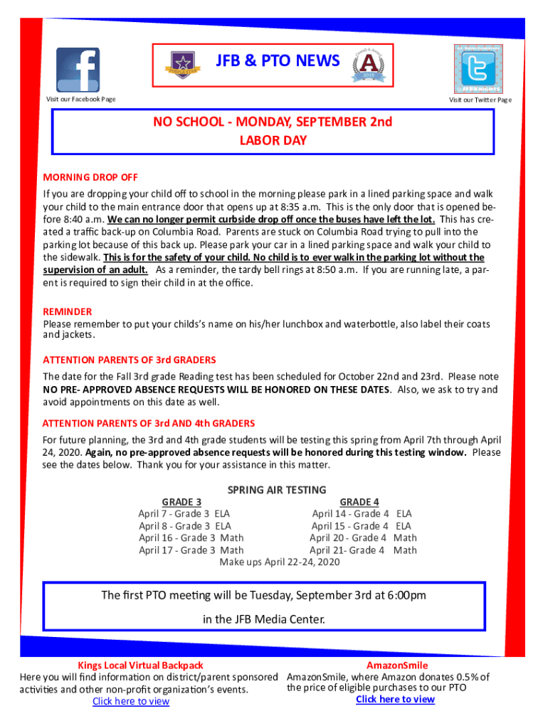 JOB & PTO NEWS Visit our Facebook Panelist our Twitter Page NO SCHOOL MONDAY, SEPTEMBER 2nd LABOR DAY MORNING DROP OFF If you are dropping your child off to school in the morning please park in a
