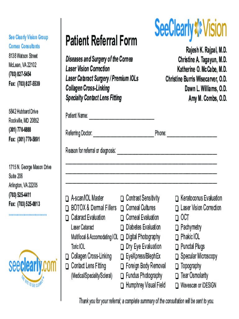 See Clearly Vision Group Cornea Consultants See Clearly Vision Group 8138 Watson Street Cornea Consultants McLean, VA 22102 See 8138Clearly WatsonVision StreetGroup (703) 8275454 Cornea McLean, Consultants