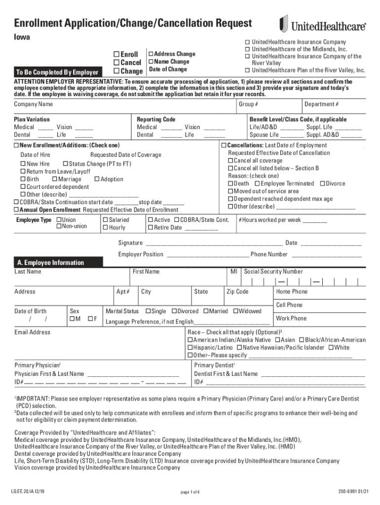 Enrollment Application/Change/Cancellation Request Iowa Be Completed By EmployerUnitedHealthcare Insurance Company UnitedHealthcare of the Midlands, Inc. UnitedHealthcare Insurance Company of the