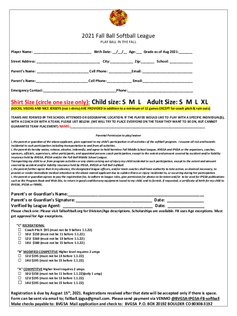 2021 Fall Ball Softball League PLAY BALL IN THE FALL Player Name: ___ Birth Date: __/__/__ Age:___ Grade as of Aug 2021:___ Street Address: ___ City:___ Zip:___ School: ___ Parents Name: ___ Cell
