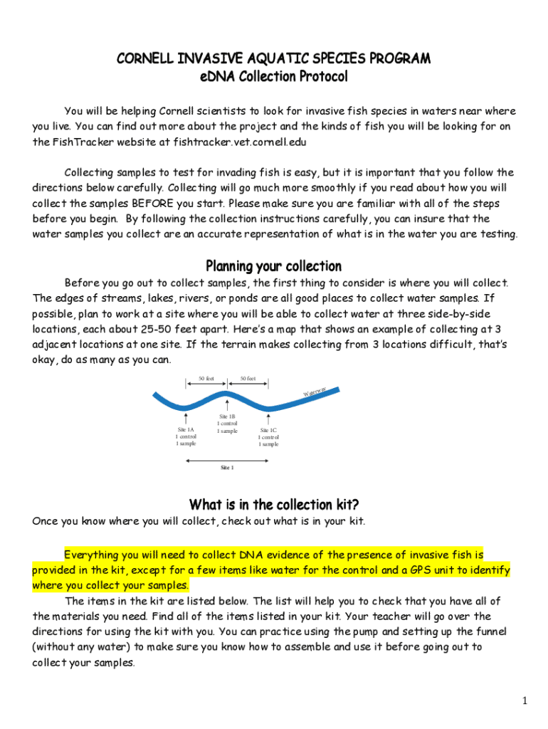 CORNELL INVASIVE AQUATIC SPECIES PROGRAM Edna Collection Protocol You will be helping Cornell scientists to look for invasive fish species in waters near where you live. You can find out more about