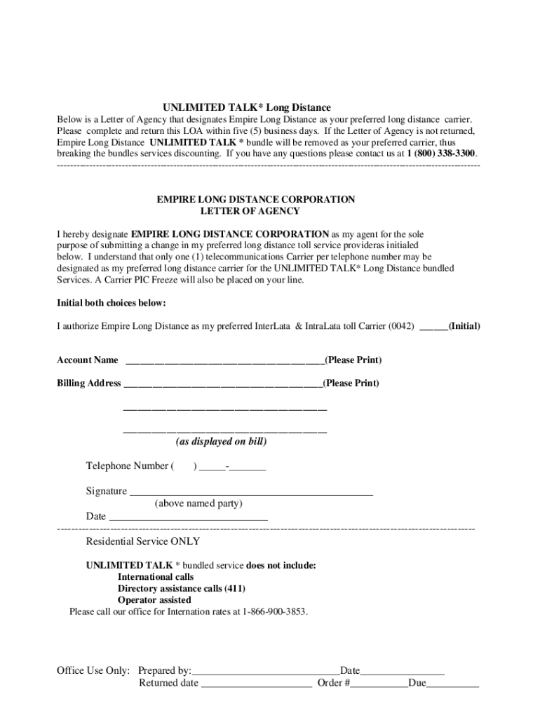 UNLIMITED TALK* Long Distance Below is a Letter of Agency that designates Empire Long Distance as your preferred long distance carrier. Please complete and return this LOA within five (5) business