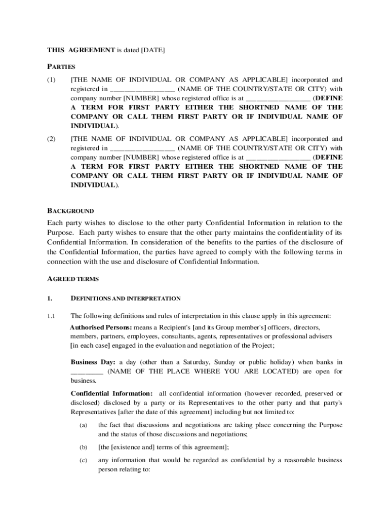 THIS AGREEMENT is dated [DATE]PARTIES (1)[THE NAME OF INDIVIDUAL OR COMPANY AS APPLICABLE] incorporated and registered in ___ (NAME OF THE COUNTRY/STATE OR CITY) with company number [NUMBER] whose