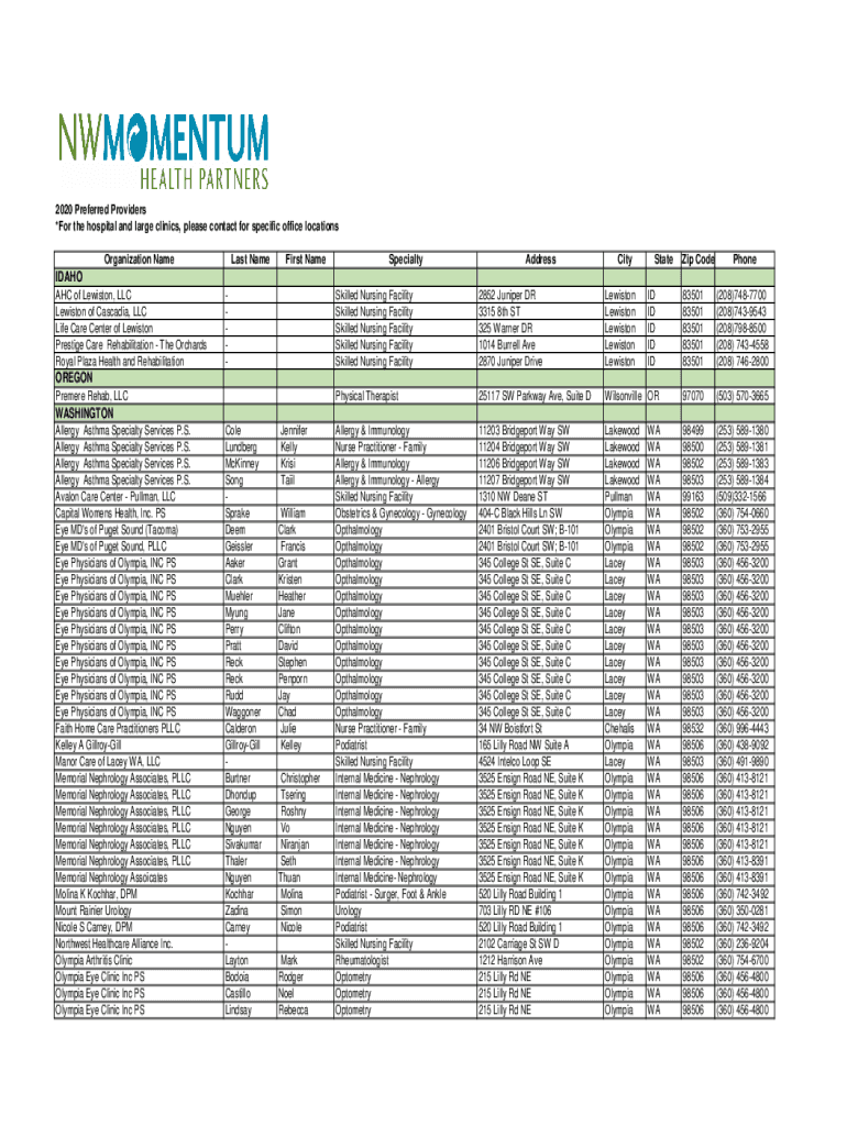 Organization Nameless NameFirst NameSpecialtyAddressCityStateZip CodePhoneIDAHO