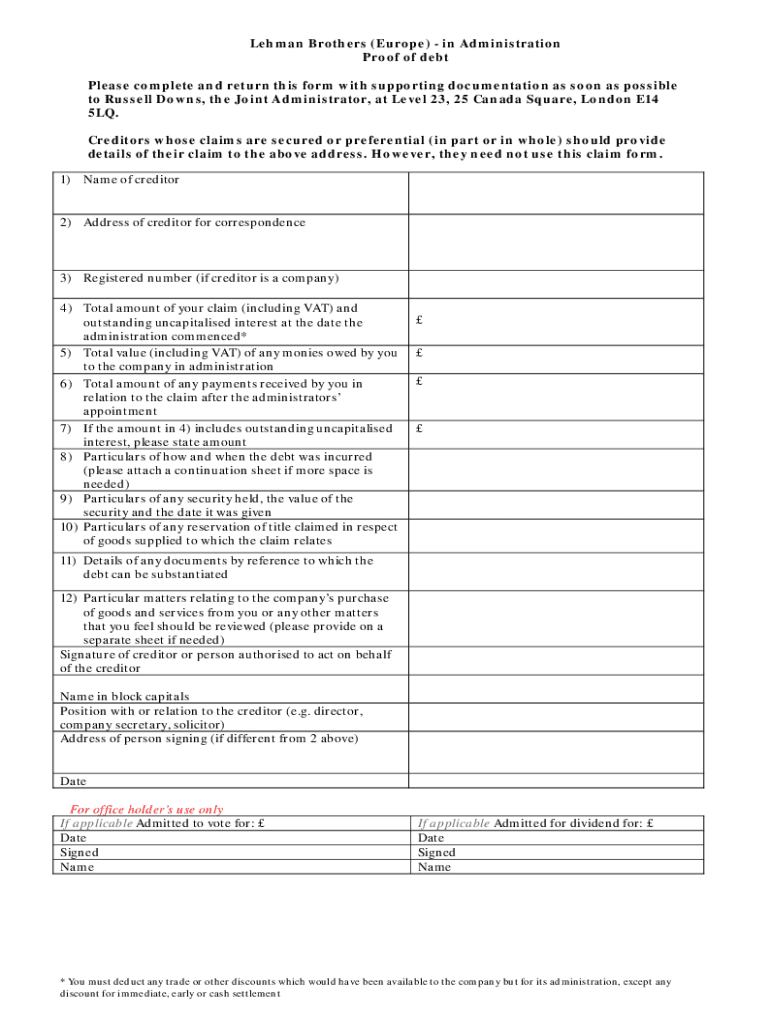 Lehman Brothers (Europe) in Administration Proof of debt Please complete and return this form with supporting documentation as soon as possible to Russell Downs, the Joint Administrator, at Level