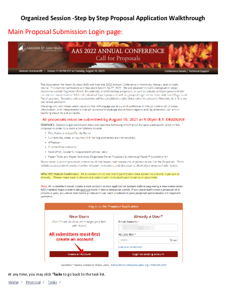 Organized Session Step by Step Proposal Application WalkthroughMain Proposal Submission Login page:At any time, you may click Tasks to go back to the task list. STEP 1 Select click here to begin a