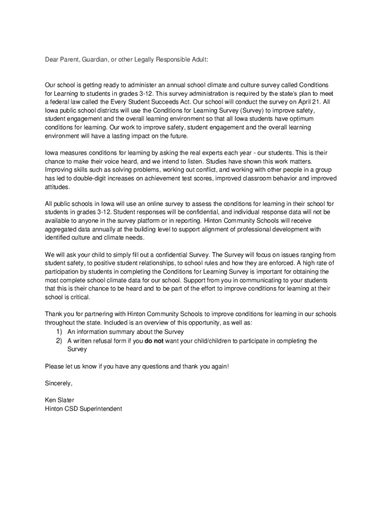 Dear Parent, Guardian, or other Legally Responsible Adult:Our school is getting ready to administer an annual school climate and culture survey called Conditions for Learning to students in grades
