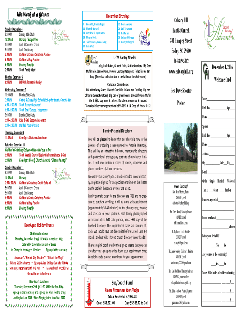 This Week at a Glance Sunday, December 4 9:30 AM Sunday Bible Study 10:30 AM Worship / Budget Vote 5:00 PM Adult & Children's Choirs 5:00 PM Adult Discipleship 5:00 PM Children's Choir / Christmas