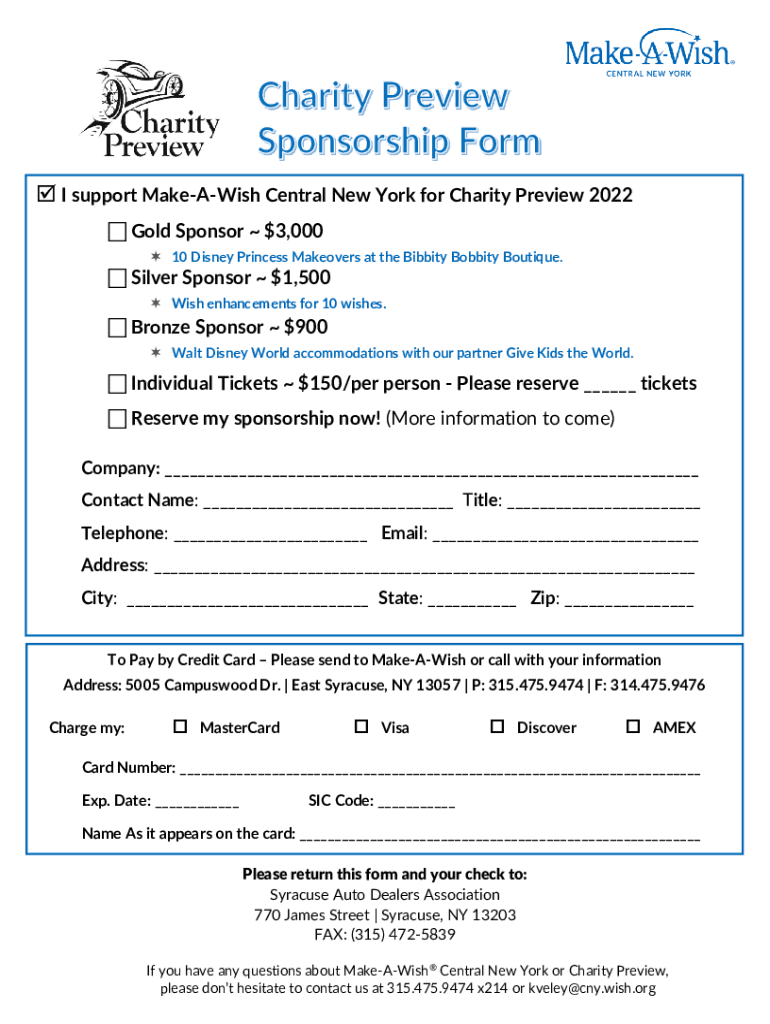 I support MakeAWish Central New York for Charity Preview 2022 Gold Sponsor $3,000 10 Disney Princess Makeovers at the Babbitt Bobbitt Boutique. Silver Sponsor $1,500 Wish enhancements for 10 wishes.