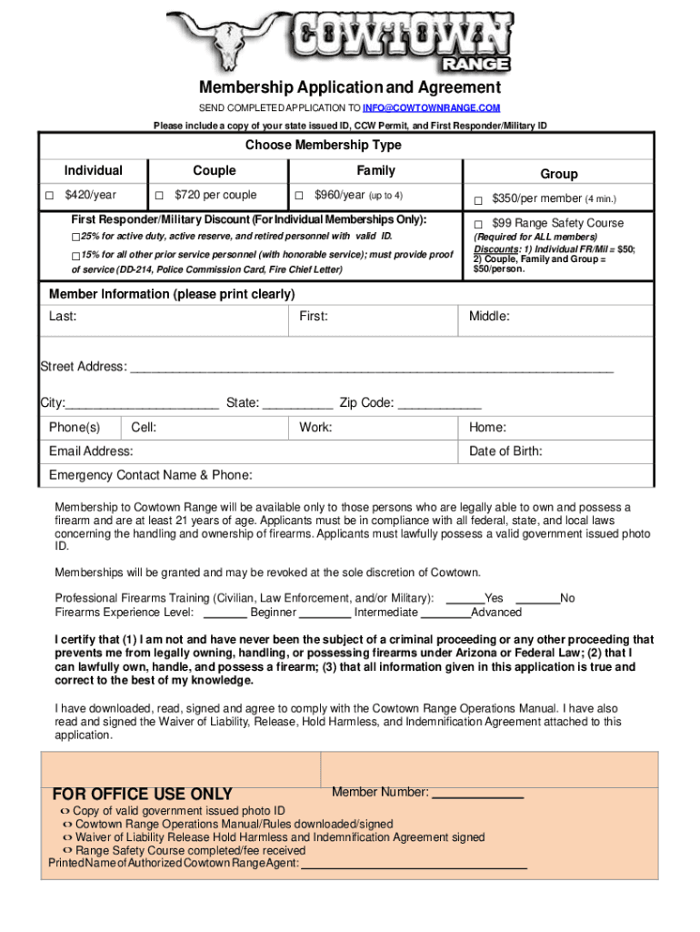 Membership Application and Agreement SEND COMPLETED APPLICATION TO INFO@COWTOWNRANGE.COM Please include a copy of your state issued ID, CCW Permit, and First Responder/Military Choose Membership Type