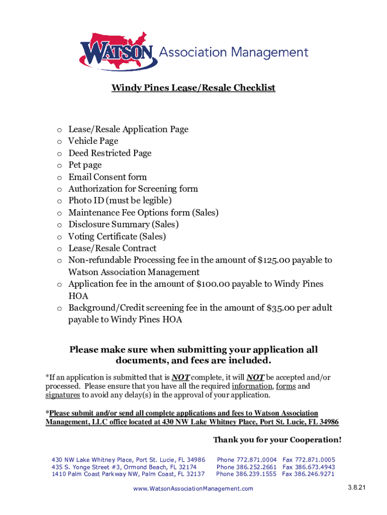 Windy Pines Lease/Resale ChecklistLease/Resale Application Page Vehicle Page Deed Restricted Page Pet page Email Consent form Authorization for Screening form Photo ID (must be legible) Maintenance