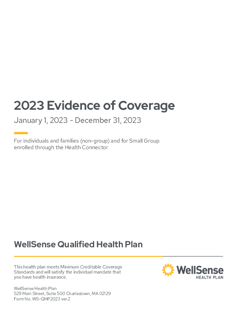 2023 Evidence of Coverage January 1, 2023, December 31, 2023 For individuals and families (nongroup) and for Small Group enrolled through the Health ConnectorWellSense Qualified Health Plan This health
