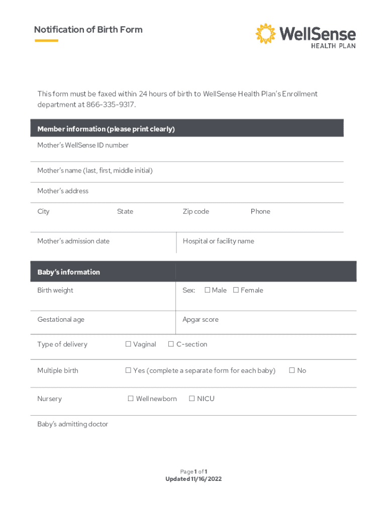 Notification of Birth Forms form must be faxed within 24 hours of birth to Welles Health Plans Enrollment