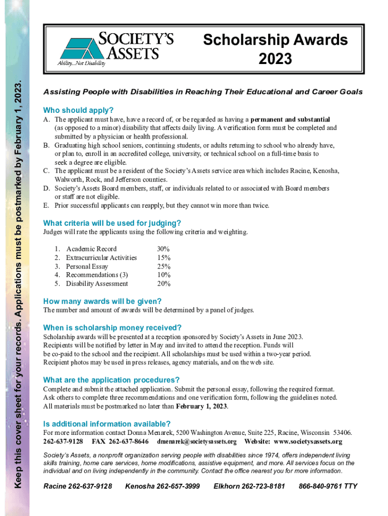 Keep this cover sheet for your records. Applications must be postmarked by February 1, 2023. Scholarship Awards 2023 Assisting People with Disabilities in Reaching Their Educational and Career Goals