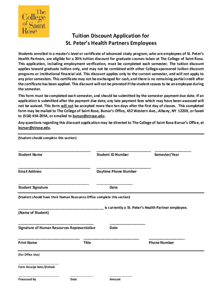 Tuition Discount Application for St. Peters Health Partners Employees Students enrolled in a masters level or certificate of advanced study program, who are employees of St. Peters Health Partners,