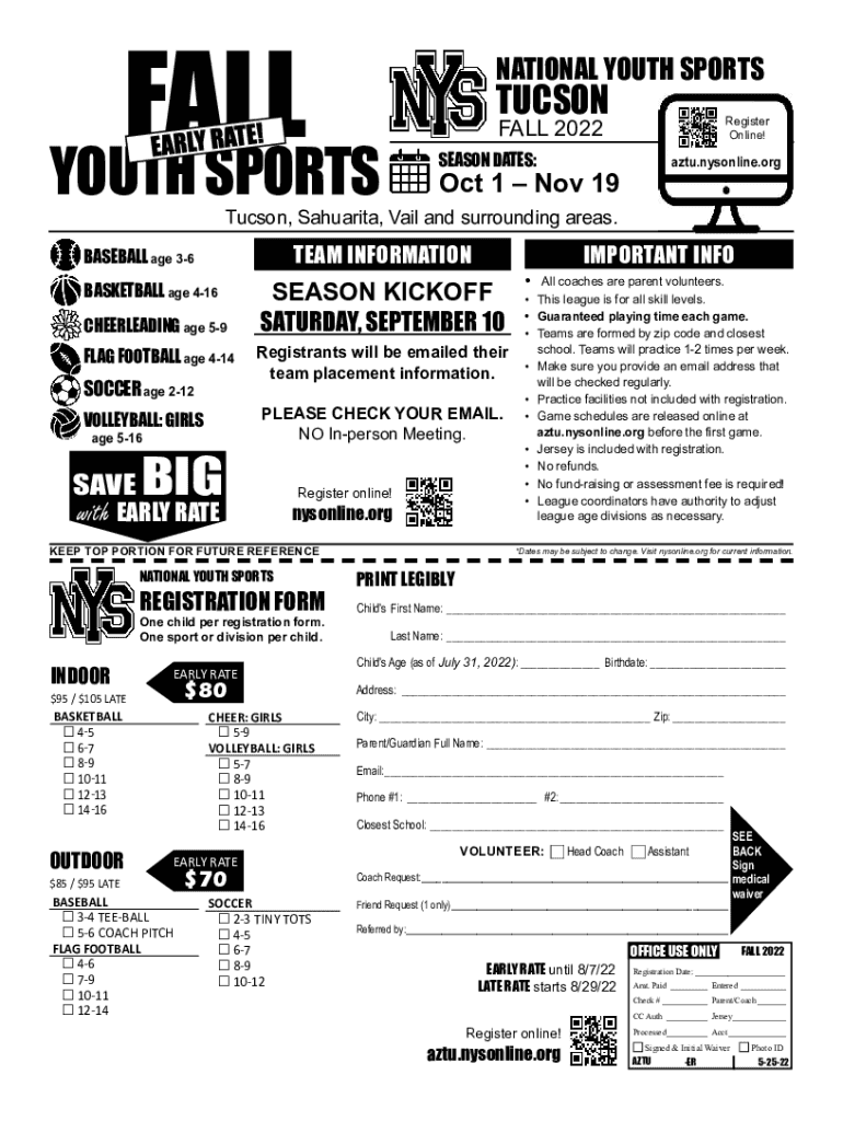 SALVATIONAL YOUTH SPORTSTUCSONRegister Online!FALL 2022YOUTH SPORTSPERSON DATES:AZT.online.org Oct 1 Nov 19Tucson, Sahuarita, View and surrounding areas. BASKETBALL age 416 CHEERLEADING age 59 FLAG
