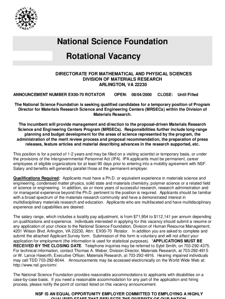 National Science Foundation Rotational Vacancy DIRECTORATE FOR MATHEMATICAL AND PHYSICAL SCIENCES DIVISION OF MATERIALS RESEARCH ARLINGTON, VA 22230 ANNOUNCEMENT NUMBER EX0070 ROTATOROPEN:08/04/2000CLOSE:Until