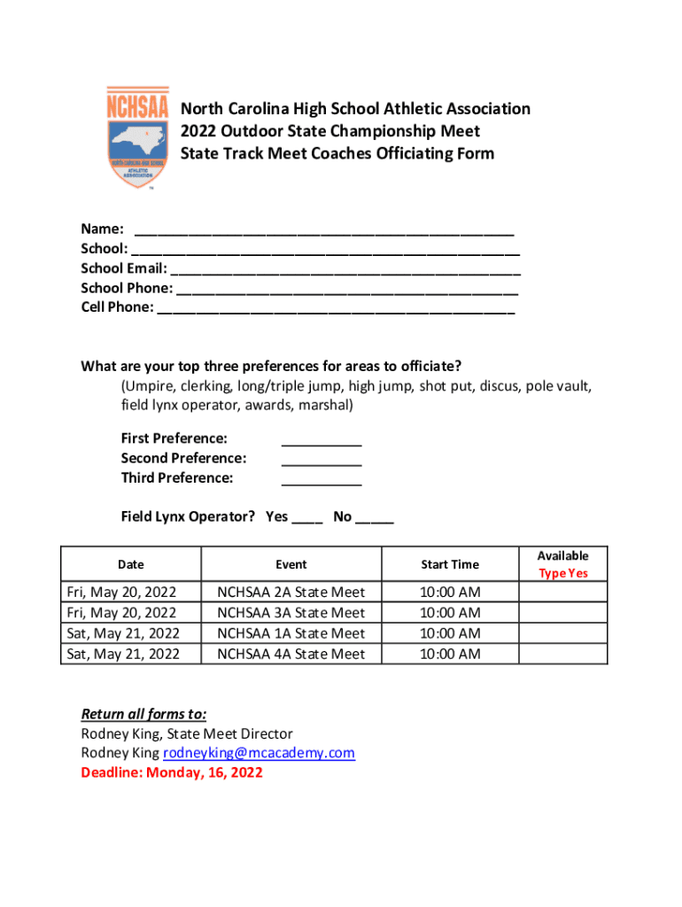 North Carolina High School Athletic Association 2022 Outdoor State Championship Meet State Track Meet Coaches Officiating Forename: ___ School: ___ School Email: ___ School Phone: ___ Cell Phone: