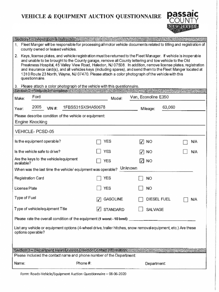 Passa1cVEHICLE & EQUIPMENT AUCTION QUESTIONNAIRECOUNTY1. Fleet Manger will be responsible for processing all motor vehicle documents related to titling and registration of county owned or leased vehicles.