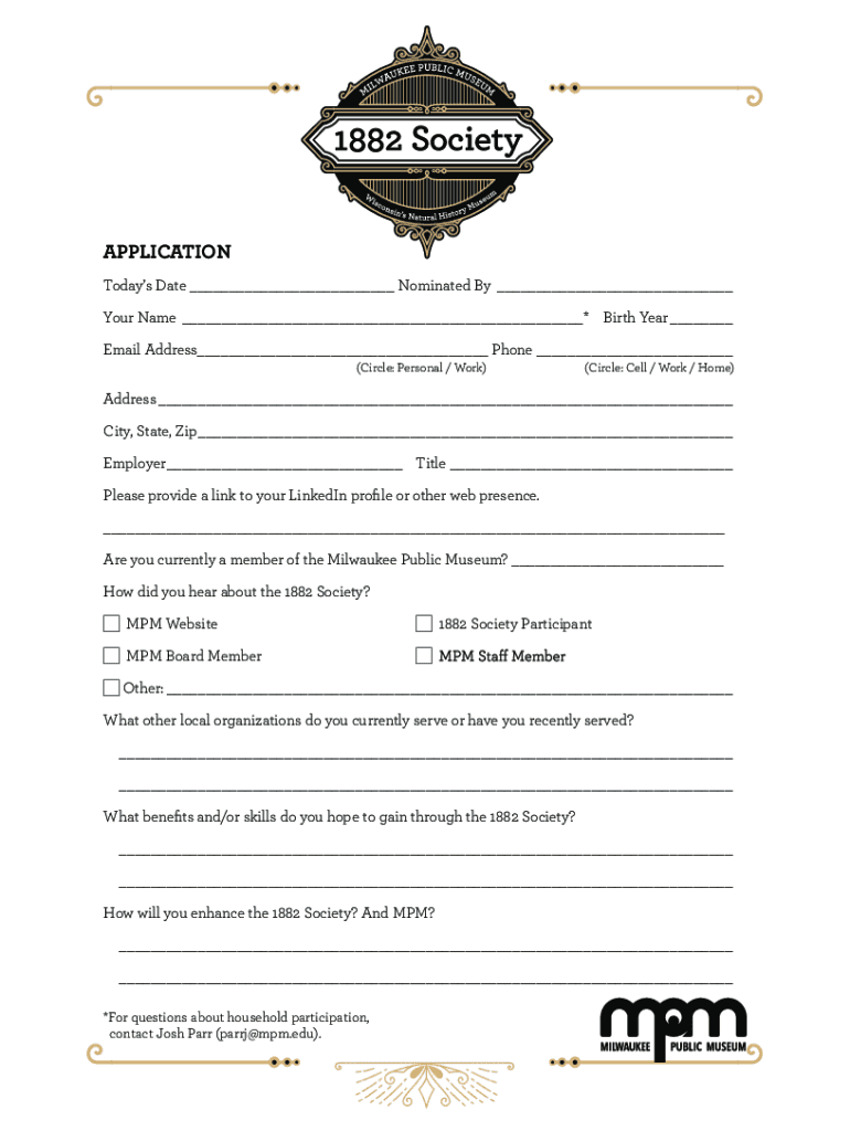 APPLICATION Today's Date ___ Nominated By ___ Your Name ___* Birth Year ___ Email Address___ Phone ___ (Circle: Personal / Work)(Circle: Cell / Work / Home)Address ___ City, State, Zip ___ Employer