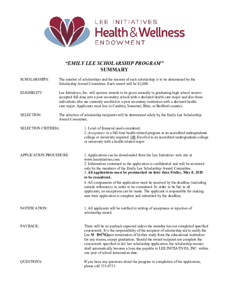 EMILY LEE SCHOLARSHIP PROGRAM SUMMARY SCHOLARSHIPS:The number of scholarships and the amount of each scholarship is to be determined by the Scholarship Award Committee. Each award will be $2,000.ELIGIBILITY:Lee
