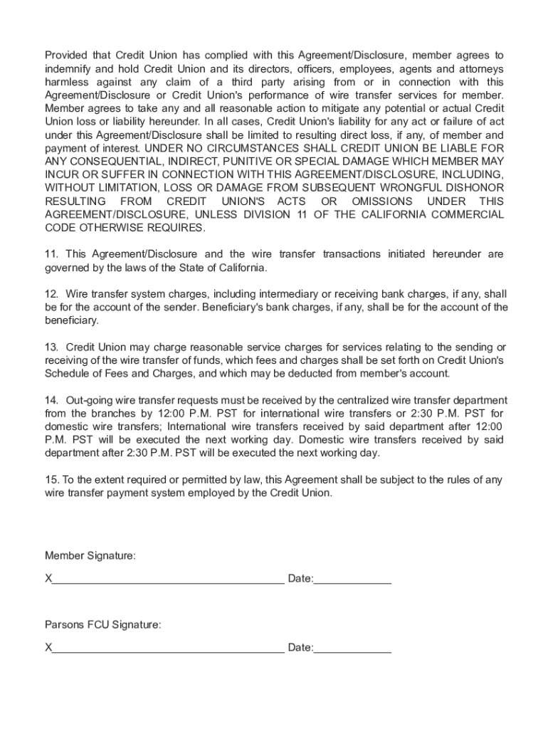 WIRE TRANSFER AGREEMENT AND DISCLOSURE STATEMENT **YOU MUST sign this disclosure form at the bottom and submit it along with your Wire Instructions for your request to be processed** Parsons Federal