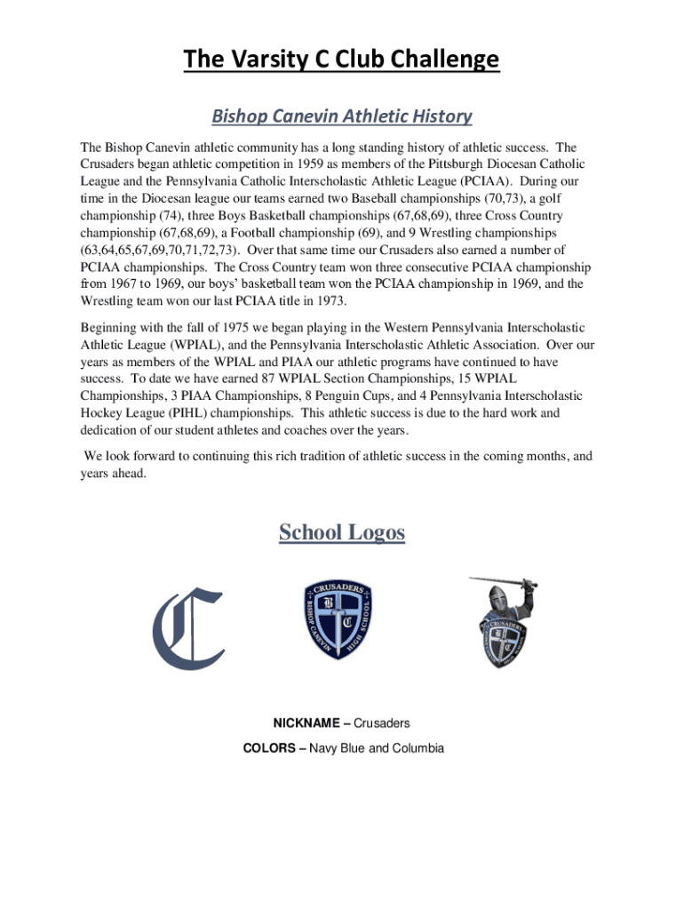 The Varsity C Club Challenge Bishop Calvin Athletic History The Bishop Calvin athletic community has a long-standing history of athletic success. The Crusaders began athletic competition in 1959 as