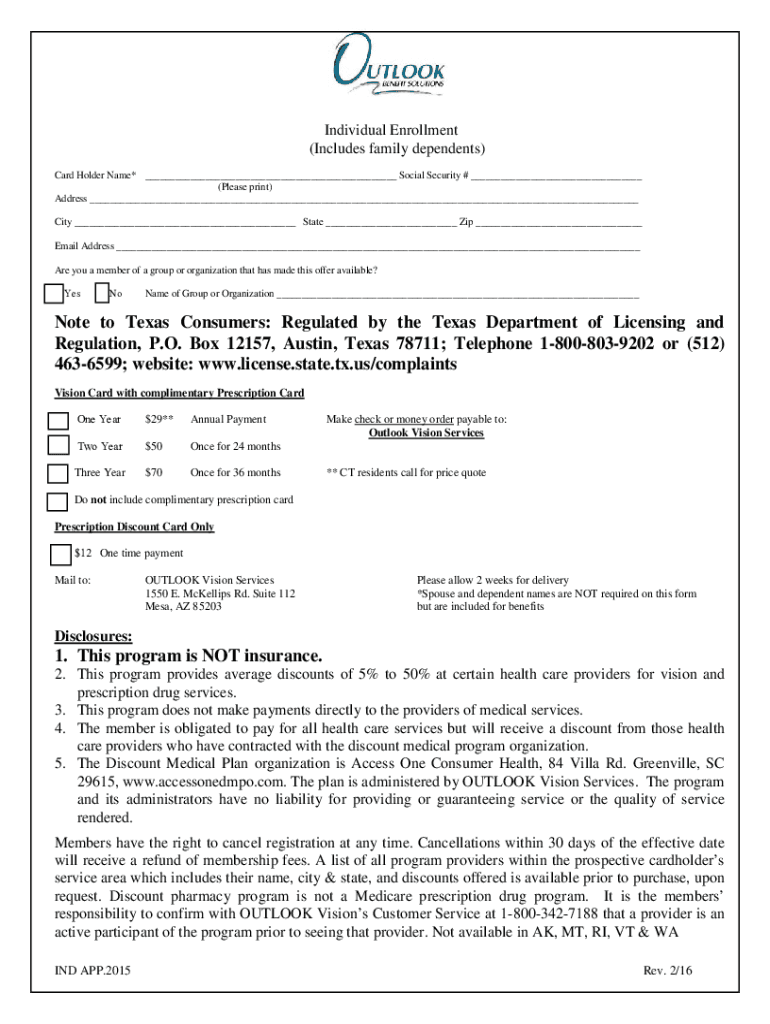 Individual Enrollment (Includes family dependents) cardholder Name* ___ Social Security # ___ (Please print) Address ___ City ___ State ___ Zip ___ Email Address ___ Are you a member of a group or