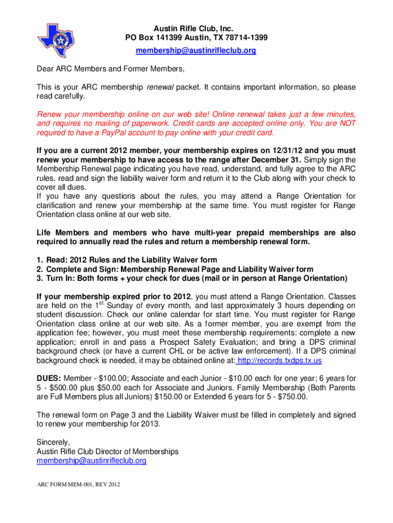 Austin Rifle Club, Inc. PO Box 141399 Austin, TX 787141399 membership@austinrifleclub.org Dear ARC Members and Former Members, This is your ARC membership renewal packet. It contains important information,