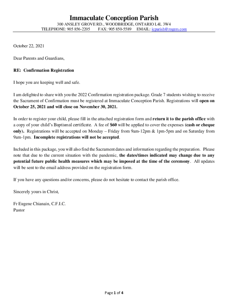 Immaculate Conception Parish 300 AINSLEY GROVE RD., WOODBRIDGE, ONTARIO L4L 3W4 TELEPHONE: 905 8562205 Faxes: 905 8505589 EMAIL: icparish@rogers.comOctober 22, 2021 Dear Parents and Guardians, RE: