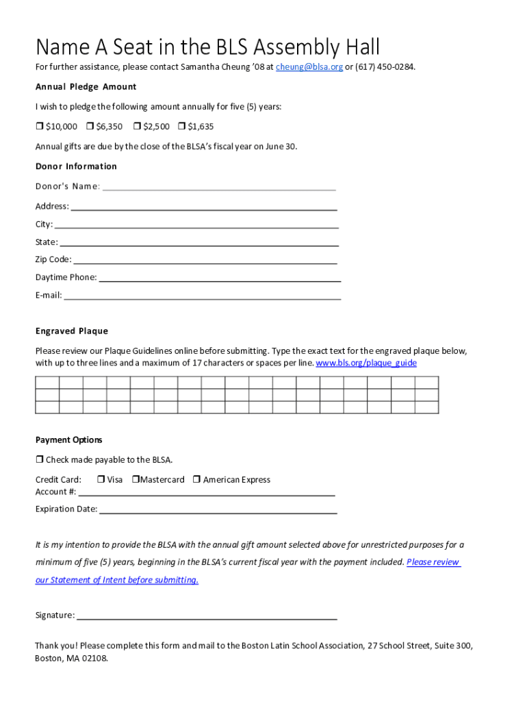 Name A Seat in the BLS Assembly Hall For further assistance, please contact Samantha Cheung 08 at cheung@blsa.org or (617) 4500284. Annual Pledge Amount I wish to pledge the following amount annually