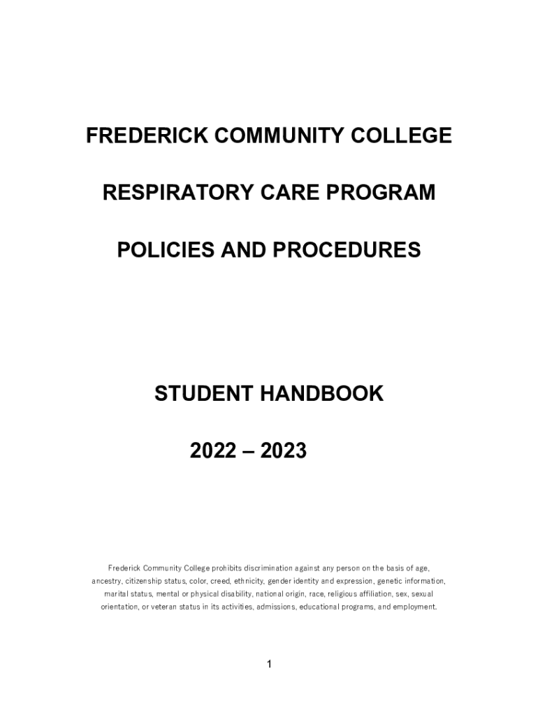 FREDERICK COMMUNITY COLLEGE RESPIRATORY CARE PROGRAM POLICIES AND PROCEDURESSTUDENT HANDBOOK 2022 2023Frederick Community College prohibits discrimination against any person on the basis of age, ancestry,