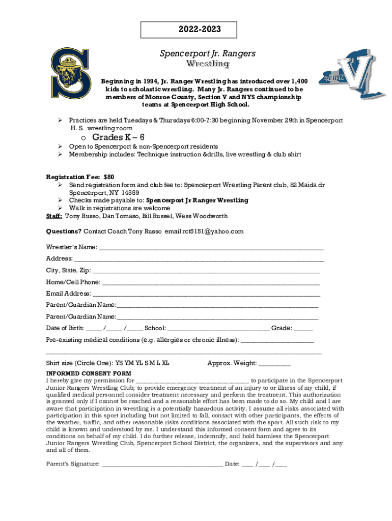 20222023 Spencer port Jr. Rangers Beginning in 1994, Jr. Ranger Wrestling has introduced over 1,400 kids to scholastic wrestling. Many Jr. Rangers continued to be members of Monroe County, Section