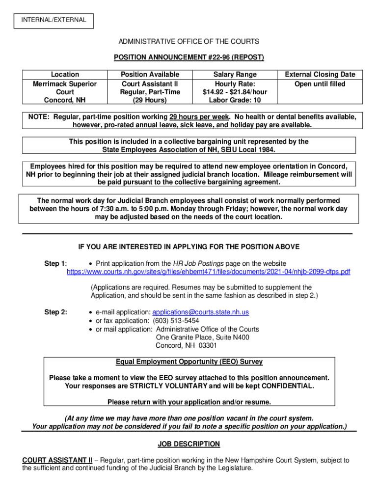 INTERNAL/EXTERNALADMINISTRATIVE OFFICE OF THE COURTS POSITION ANNOUNCEMENT #2296 (REPOST) Location Merrimack Superior Court Concord, Position Available Court Assistant II Regular, Maritime (29 Hours)Salary